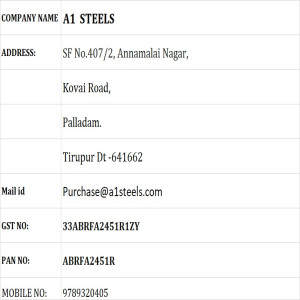 A1 STEELS S.F.NO - 321,323, A1 STEELS, TRICHY MAIN ROAD, KALLUVETTIKADU, KALIVELAMPATTI, PALLADAM, Tiruppur - 641662.